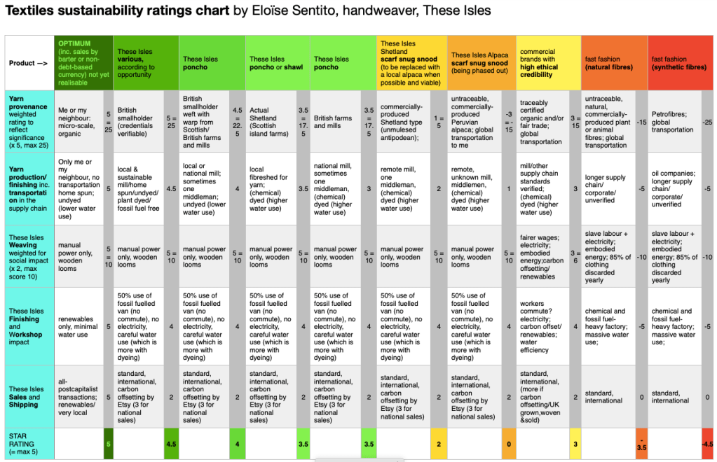 Clearly the damning indictment I make of commercial clothing companies on the right here in orange and red is broad brush and there are, increasingly, exceptions: economies of scale don’t always entail economies of ethics – just usually. Whilst the once and future village of perfect sustainability should ideally constitute sole-trading craftspeople and teency cottage industries, sometimes a *slightly* larger but super-conscientious cottage industry can perform even better, for instance on efficiency of water use – though beware chemical use (formaldehyde, chlorine, to name but two). Avoid sweatshops, obviously. Check with every brand you buy. Or, for peace of mind, just support a highly principled artisan here.